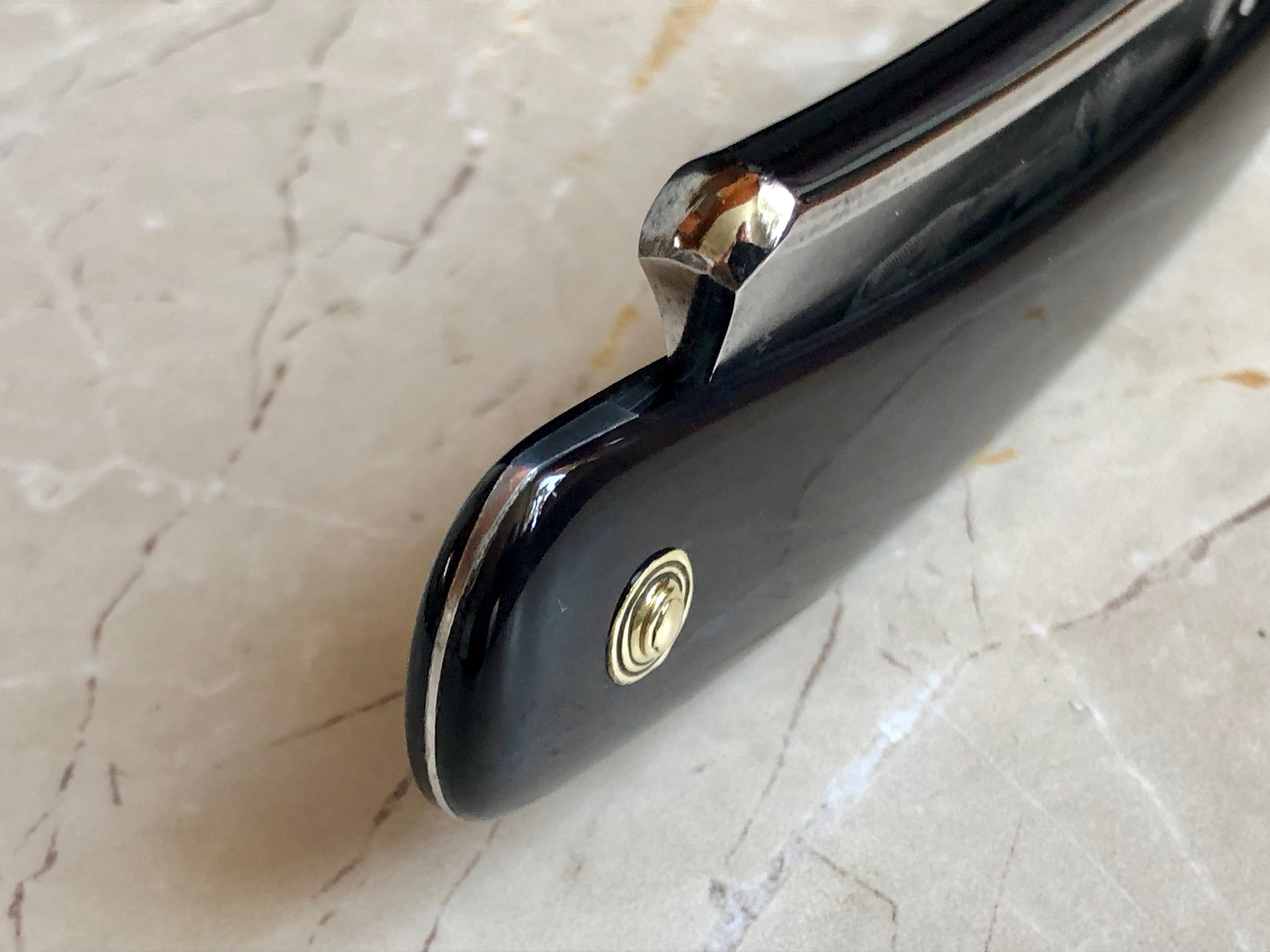 и замечательные изделия - приятно смотреть. По поводу последней его работы, без всяких обид - лично для меня показалось, что бритва стала слишком новой. Я хотя бы немного состарил эти новые заклёпки, уж слишком бросаются в глаза. Но это только моё мнение, у каждого своё виденье работы. Бесит, когда приходится пользоваться бритвой моложе себя...