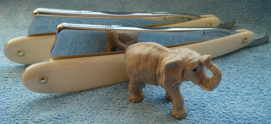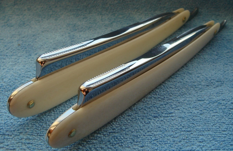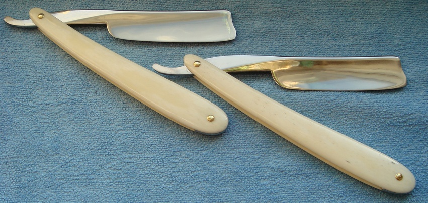 Re: Бритва до... и после...День добрый Уважаемые форумчане! Вот решил еще разок выставить свою работу, дабы услышать конструктивные отзывы и советы. Бритвы HUNTER & SON SHEFFIELD (сладкая парочка) прошли полный апгрейд, полотна вычищены, ручки новые(кость верблюда, во как то так) клины олово без изысков.