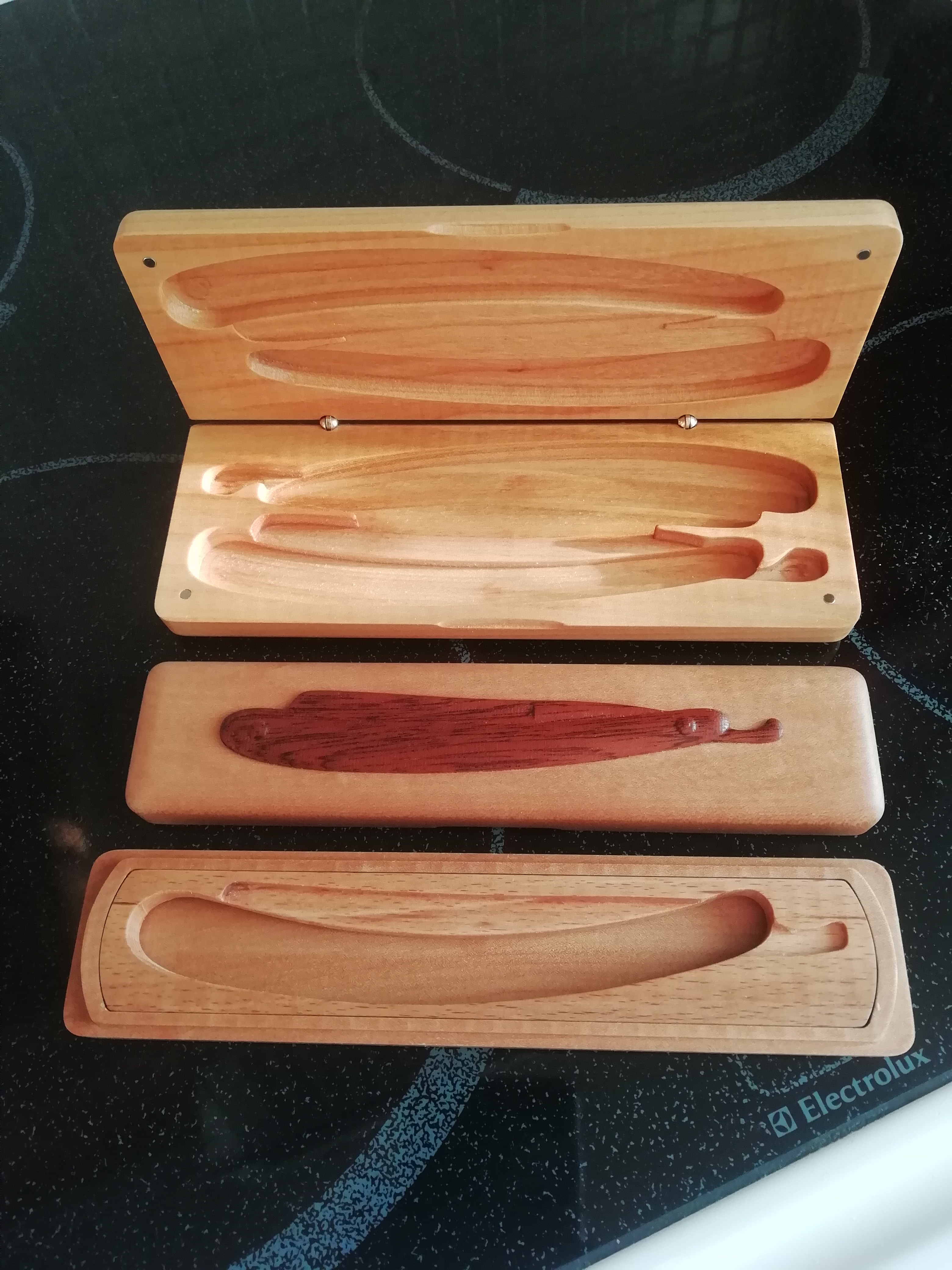 Футляр для опасной бритвыКлен и вишня. Походный футляр на 2 бритвы и на 1 бритву, с интарсией бритв из сапели в крышках. Гарнитур. Вкладыш из бука, но цвет гармонирует.