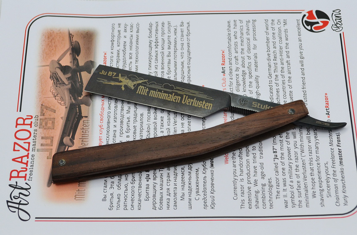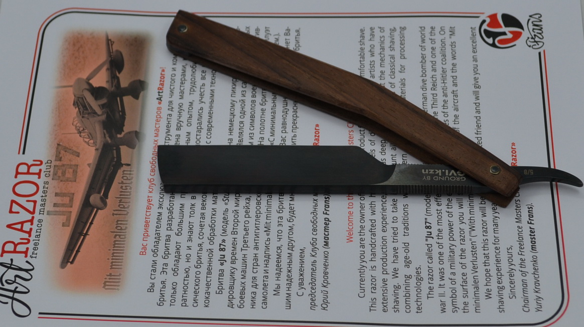 Модель "Штука" Те же участники. Ширина 5/8, оксидирование, лазерная гравировка, ручка - палисандр. По форме повторяет плоскость крыла типа чайка. Во избежание холивара, скажу, что проект занейтрален, не несет в себе никакой политической составляющей, и является просто очередной работой на тему - военная авиация. Анонс: следующая в этой теме будет Пе-2.
