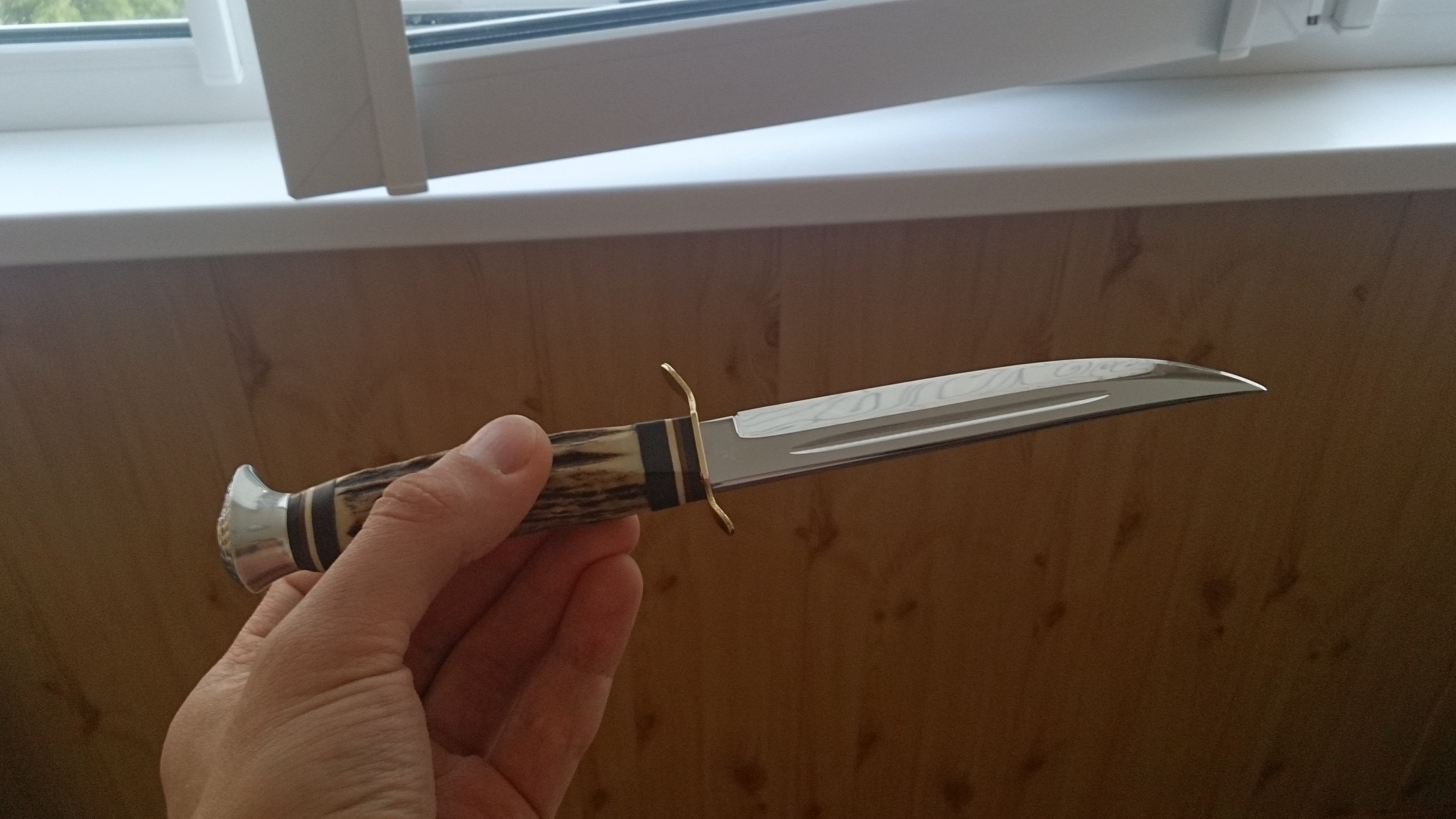 Характеристики следующие: Общая длина: 235 мм Клинок: 135 мм Толщина обуха: 4 мм Ширина клинка: 20 мм Рукоять - рог, набранная кожа. Сталь клинка - углеродистая, около 57 HRC. Несмотря на внешний вид и некоторые особенности, на кухне и в быту оказался очень удобен.