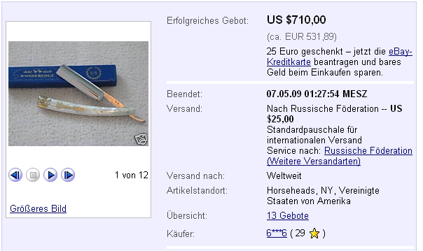Т.е. либо в истории бритвы, либо в участнике, либо в стране его пребывания. Как неоднократно подмечено - участники из австралии ЛЕГКО перебивают любую ставку по хорошим абразивам. Т.е. они тупо готовы переплатить в 2 раза - вероятно проблема в том что обычно мало кто туда отправляет и уровень жизни у них. Потом есть один коллекционер по абразивам - также тупо заводит снайпер на баснословные деньги. Так где он замечен я никогда не учавствовал. И тут так же - м.б. какя нибудь коллекция известного коллекционера продается... так что врядли это просто цена.