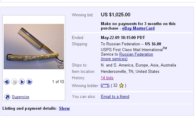 Я обычно за такие бритвы близко не впрягаюсь. А вообще я за ебае заметил некую сезоннсть и переоды обострения. Наример год назад был колоссальный спрос на камни а потом вдруг иссяк и цены упали в течении месяца в 2 раза. И сейчас чего то всплеск интереса к бритвам, так что цены подросли относительно моих предположений...