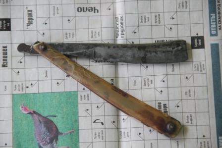 Просьба оценить.Давно лежала у меня сиё чудо и никак руки не доходили разместить фото и спросить что стоит бритва в таком состоянии? Как я понимаю,это конец 18 начало 19века и ручка с пинами,вроде родные.