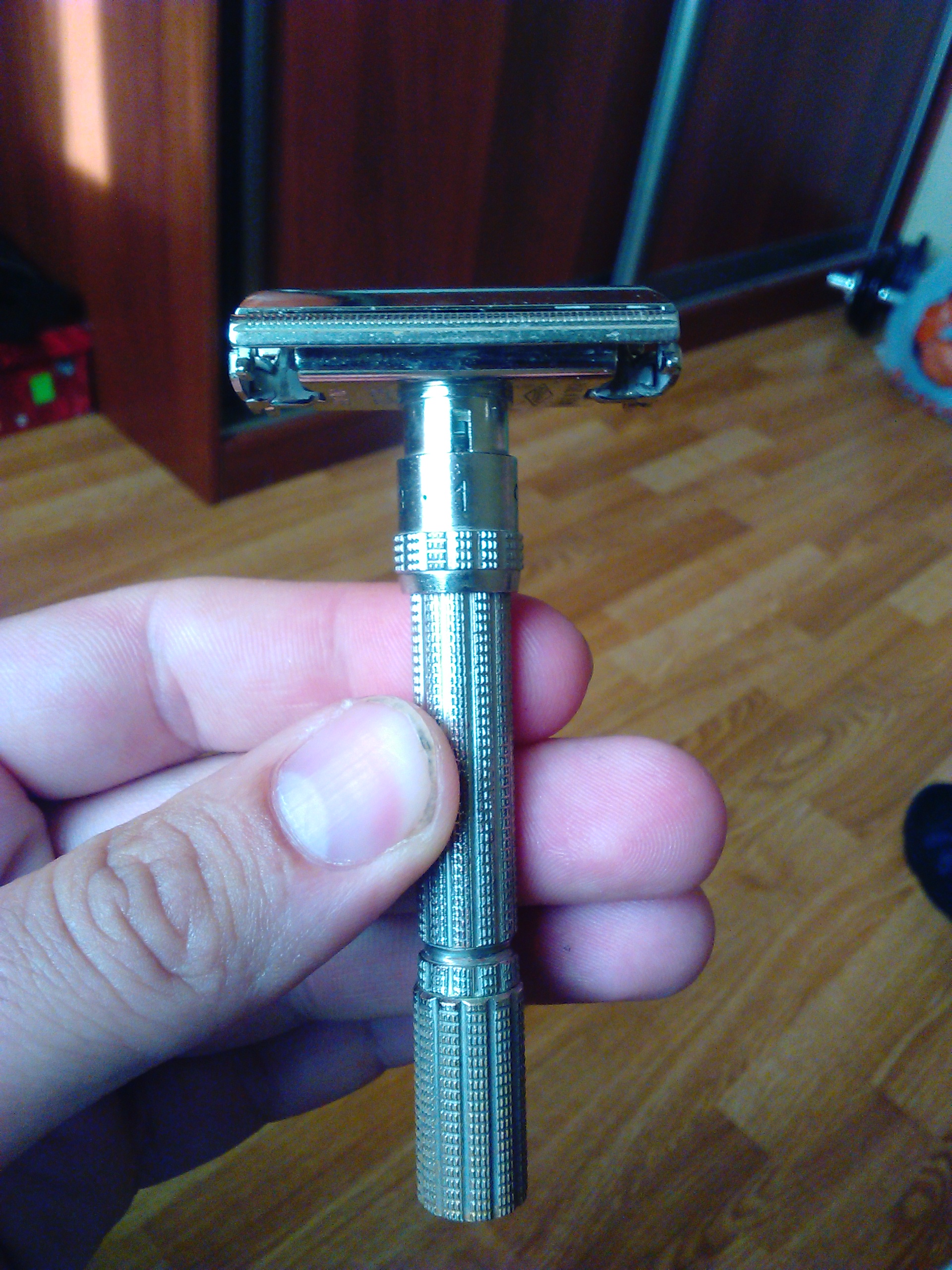 Т-образные станкиБритвенный станок Woolco-Extra. Я его купил у старьевщика, а он, в свою очередь, выменял его на монеты. Ему сказали, что станок был найден на чердаке какого то старинного дома, больше ничего не известно. Вот фото станка в исходном виде, латунь почернела, но хром на крышке был в общем то целый, за исключением одного продольного обдира и хаотичных царапин сверху на крышке (довольно глубоких). На внутренних поверхностях крышки и штырях, хром сохранился отлично.