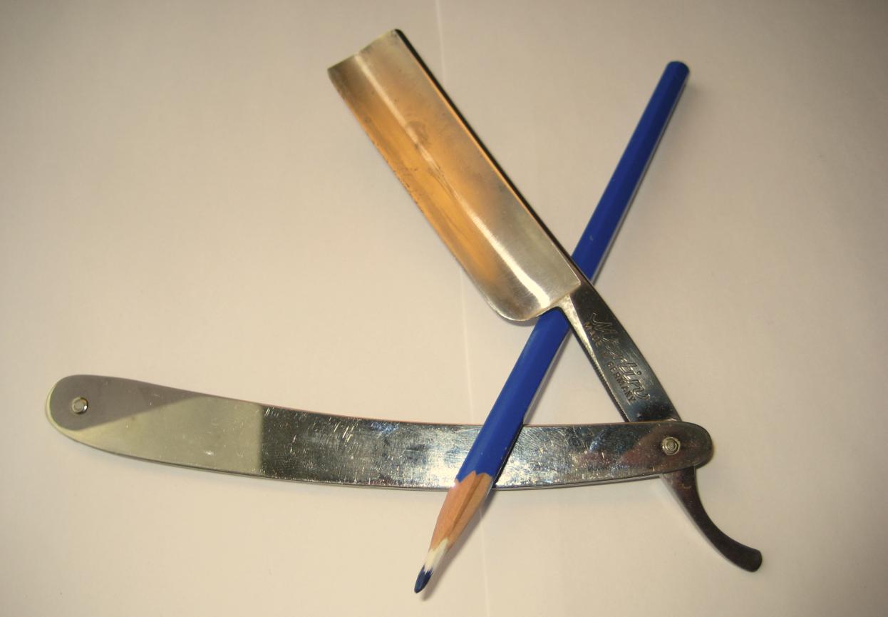 Начал рассматривать - стороны обработаны неодинаково, глянул в профиль - ба, микротом. Я так понимаю, что это лабораторный инструмент, для бритья не использовался?