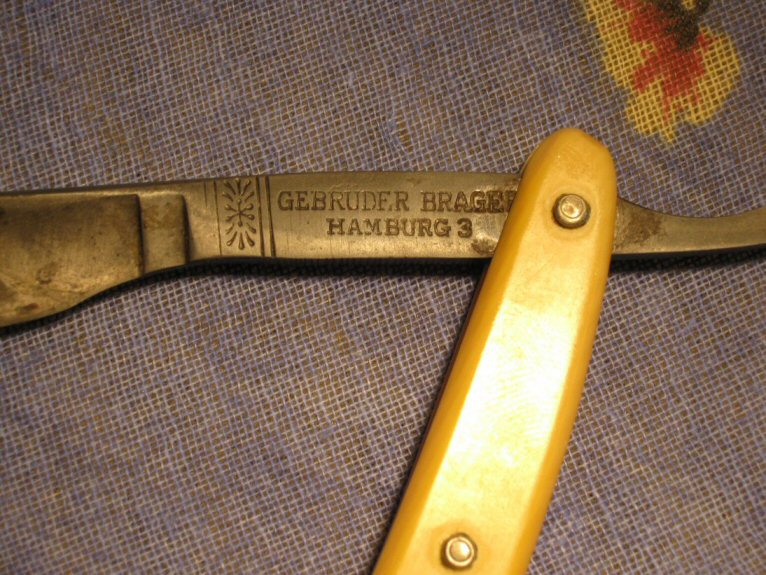 Re: GEBRUDER BRAGE(?), Hamburg 3Только что поговорили с Олег Бритва'ом насчет этой бритвы - форма интересная, и мне кажется, клинок сточен "без палева" в районе пятки. Скорее всего, бритва подвергалась кустарному ремонту, т.к. срез проходит как раз через так называемую ступеньку. Возраст "на глаз" - 30-50 годы прошлого века, более точную дату скажем при дальнейших поисках.