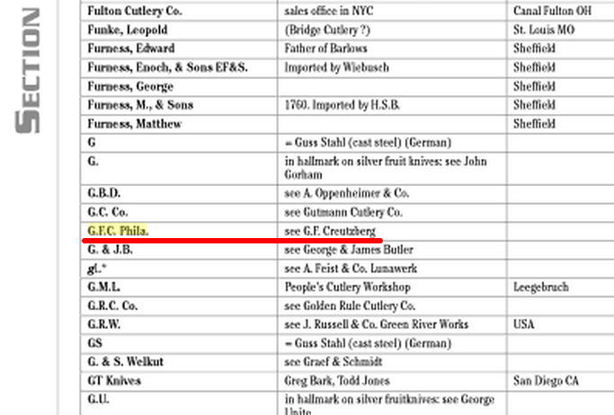 Re: Cowman, The Improved Eagle Razor, GermanyЕсли источнику "Blade's Guide to Knives & Their Values" за авторством Steve Shackleford можно доверять, то G.F.Creutzberg занимался выпуском складных ножей "Pocketknife brand - G.F.C.Phila"