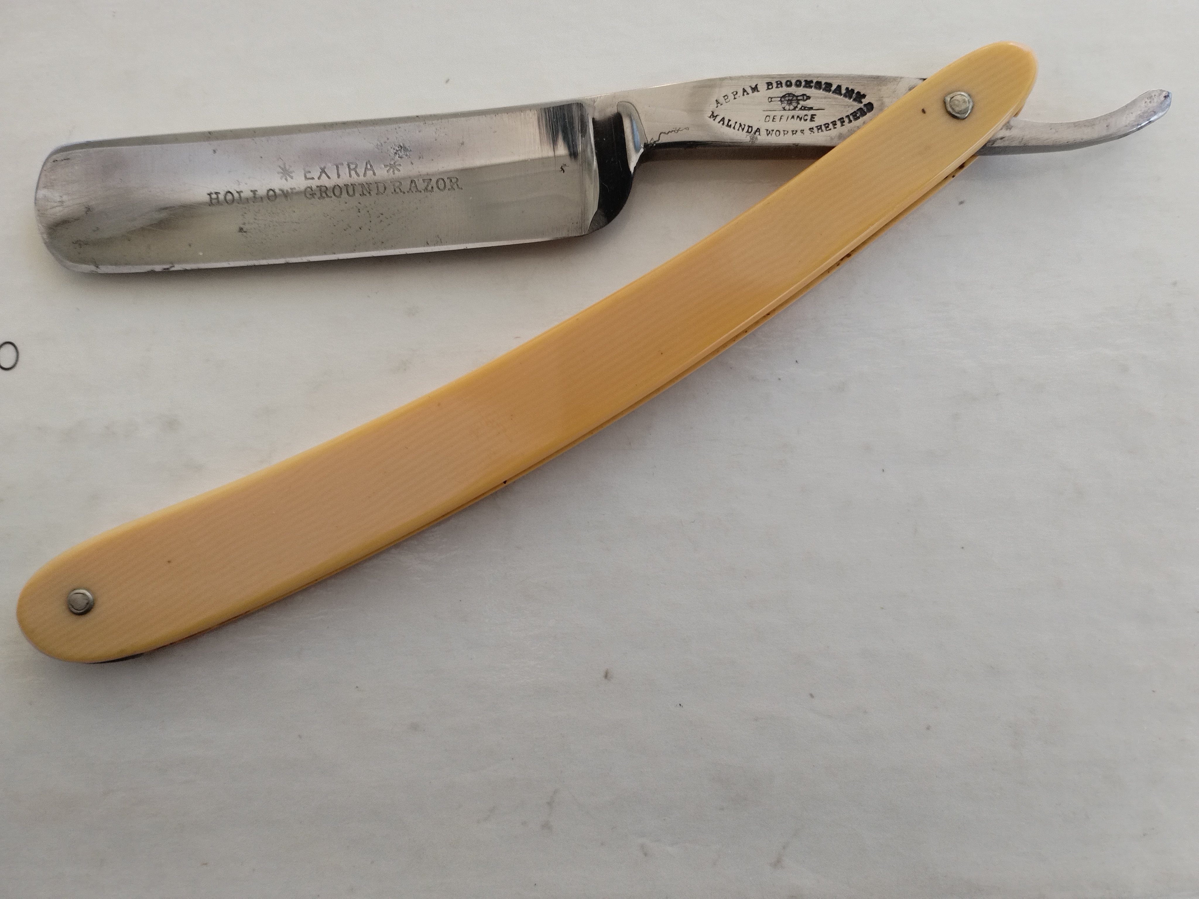 А люди из "места опасных бритв" вот что пишут: Abram Brooksbank родился в Лондоне в 1822 году, переехал в Шеффилд в 1847 году. В 1849 году Brooksbank купил бизнес William Hoole и создал фирму Hoole & Brooksbank, на улице Malinda. Товарная марка - "DEFIANCE", а сверху полевая пушка. В конце 1880-х фирма стала называться Abram Brooksbank & Co. Brooksbank умер в 1896 году. Его фирма продолжала работать на улице Malinda до 1932 года, пока на перешла во владение Eye Witness Works с улицы Milton. Компания была в списках производителей вплоть до1965 года. А ещё один источник называет дату смерти Abram Brooksbank 1891 год. Это подтверждает несколько источников. Ещё один аглицкий источник пишет: 3738, Abram Brooksbank, Steel and File Manufacturer, Malinda Works, Malinda Street Как я понял из нижнего документа, его имя известно в 60-х годах 18-го столетия как производителя напильников, рашпилей и шлифовального инструмента. Воды реки Don давали возможность работать. Судя по всему, за годы работы ассортимент производимой продукции был весьма и весьма разнообразен.