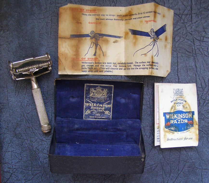 Комплектация: коробка - металл, в очень хорошем состоянии, две инструкции (на бритву и на правку), оригинальное лезвие с гравировкой, собственно станок.