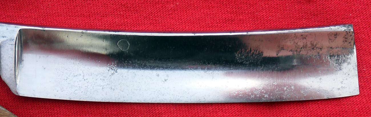Ручка - рог, целая, но много трещин по краям. Думаю, что после шлифовки/полировки станет выглядеть поинтереснее. Видимо, переклепывалась, т.к. клинышек отсутствует. По центру вставка из белого металла, предположительно серебро.