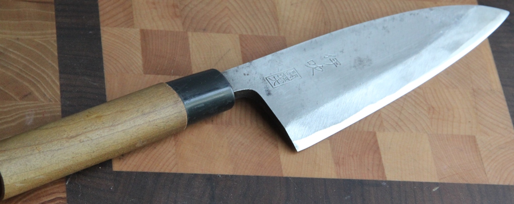 Вот такой кухонник хочу предложить сегодня. Нож достался от старого японца из Киото. По его словам, находился в его семье очень много лет. Не уточен, ухожен. Сталь-углеродка. Какая именно-Аогами или Широгами-не знаю. Сталь требует определённой культуры пользования и особого внимая, т.к. ржавеет мгновенно. Но, режет как... :roll: Предназначен для разделки рыбы, курицы, мяса.При качественной заточке прекрасно справляется с тонкой нарезкой помидоров, колбасных изделий и т.д.