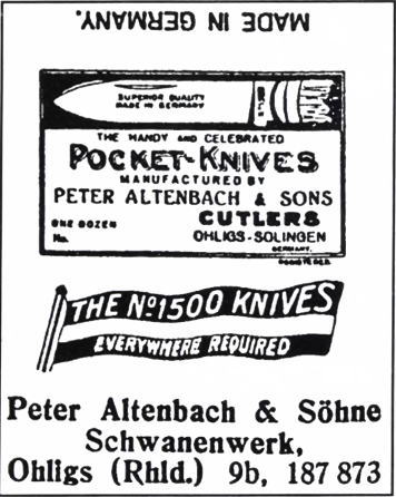 Есть инфа, будет время - выложу! Грамм из инэта: Источник 1932 года: Peter Altenbach & Söhne Schwanenwerk, Solingen, Ohligs. Производство опасных бритв и лезвий. Ремонт опасных бритв, звонить с 11-00 до 23-00, +79267729357, (viber, whats app, telegram, VK), спросить Олега.