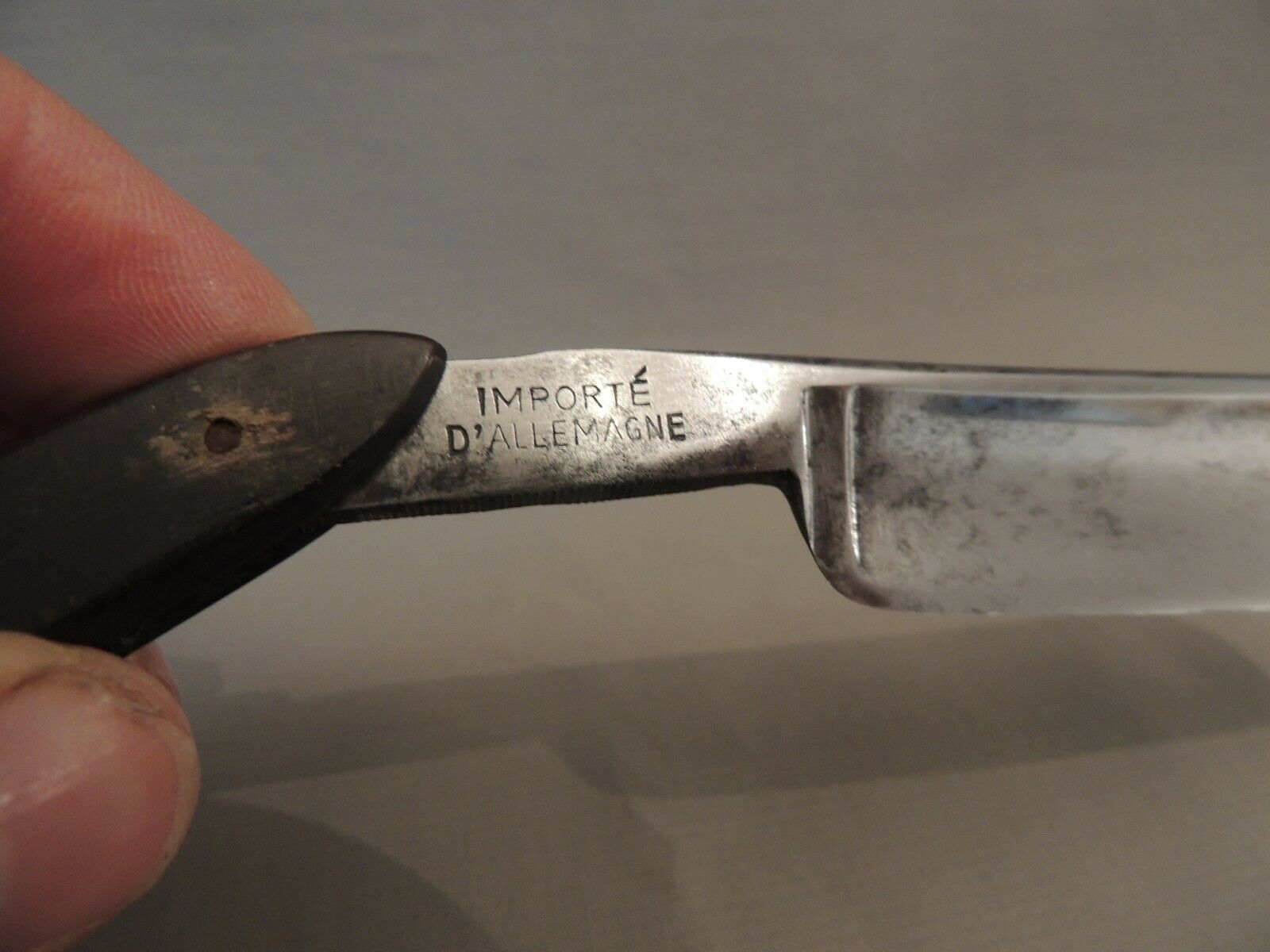 Она была очень ржавой и со сломанной оправой. Точное копие ее ручки сделал из другой, погибшей немки. Вот фото. Внизу, оригинальная ручка. Может быть, надо изменить название темы, потому что возможно будут еще золингеновских бритв, сделанных на экспорт для Франции.