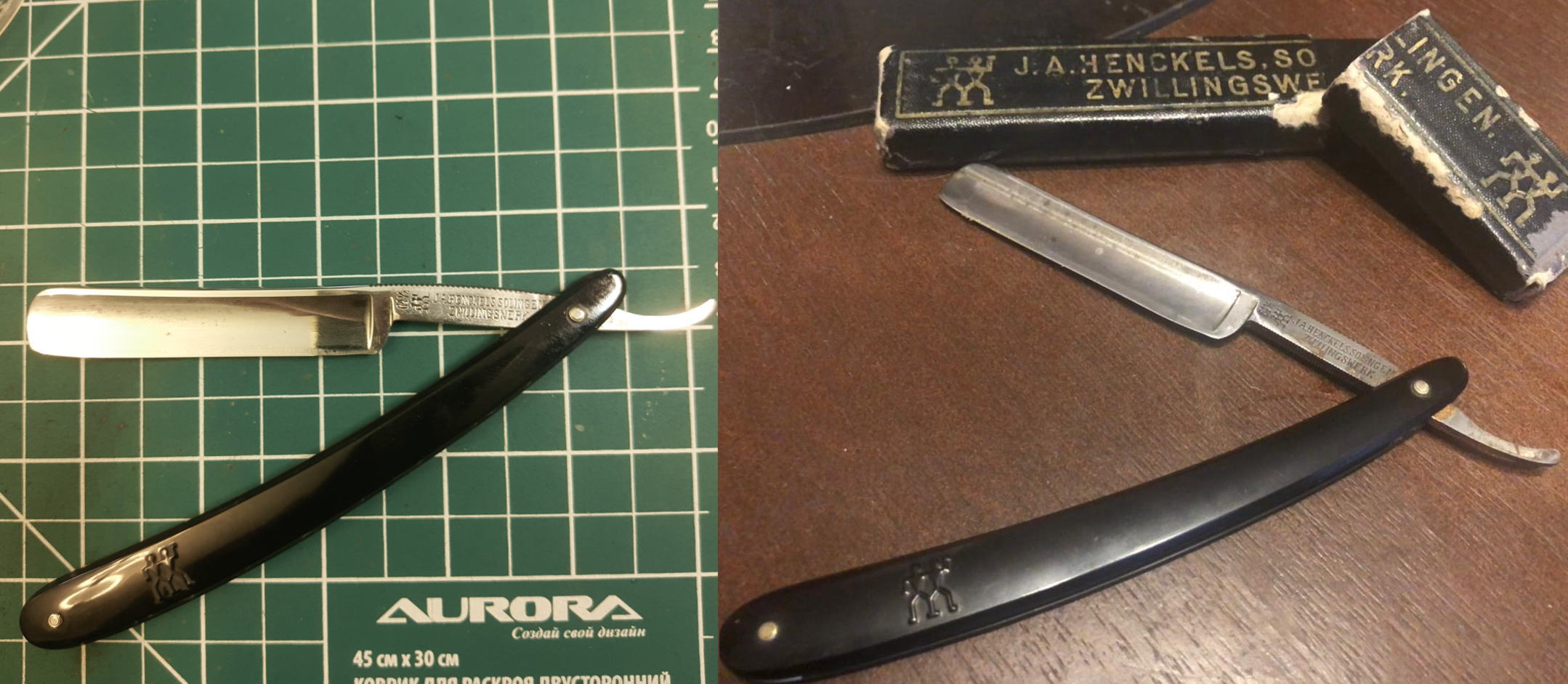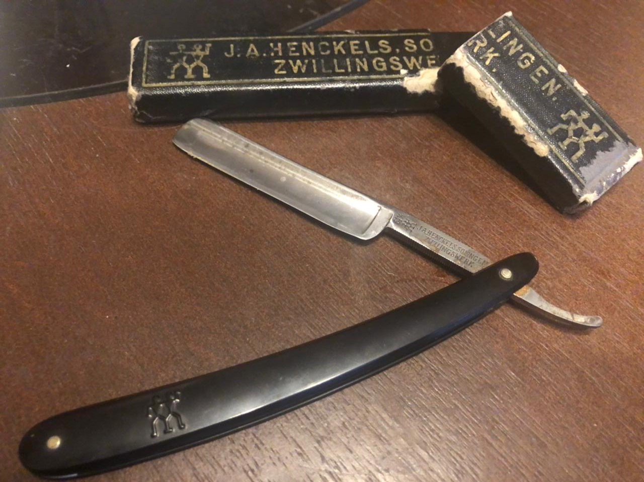 Некоторые бритвы Henckels уже отработали своё. Одно такое лезвие имеет знак Близнецов и ряд глубоко вытравленных цветов. Лезвие было найдено с резной ручкой, которая сделана предположительно из кости, несмотря на довольно бледный и гладкий вид поверхности. Большинство моделей резных ручек других фирм оформлены довольно несложно, в виде прямых линий или, возможно, резных вдоль края ручки. Резные ручки Henckels более сложны в оформлении, и бывают изменены даже по контуру. Задняя сторона хвостовика этой бритвы маркирована «GRAEF/SCHMIDT». Коробка из-под ножниц указывает на то, что эта фирма была какое-то время единственными торговыми представителями бритв Henckels в Соединённых Штатах.