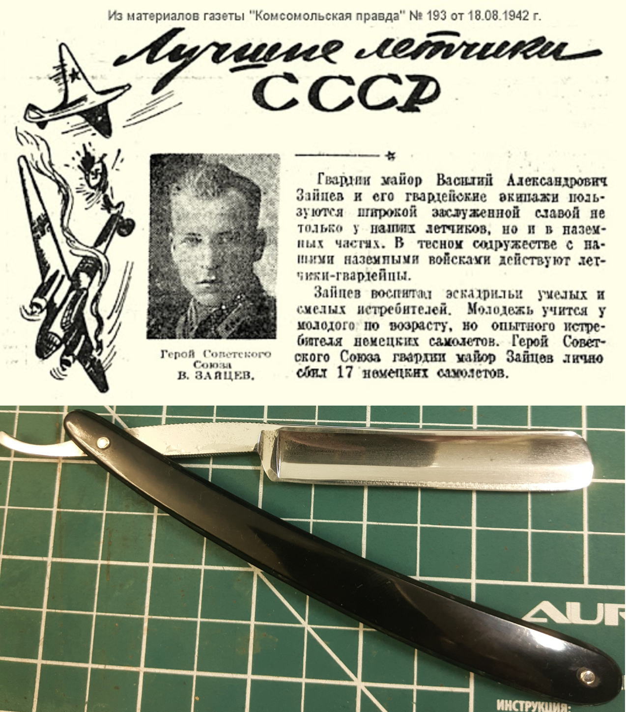 Опасная бритва воздушного аса Зайцева Василия Александровича полковника Советской Армии, участника Великой Отечественной войны, дважды Героя Советского Союза. В ремонт привозил правнук.
