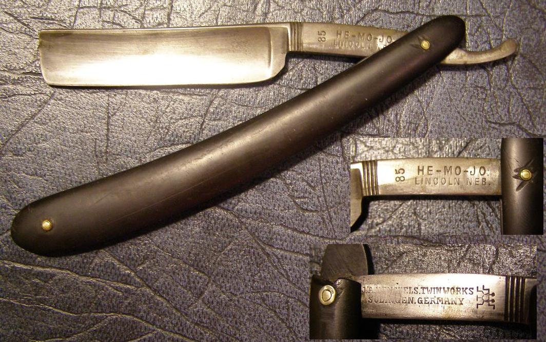 Некоторые бритвы Henckels уже отработали своё. Одно такое лезвие имеет знак Близнецов и ряд глубоко вытравленных цветов. Лезвие было найдено с резной ручкой, которая сделана предположительно из кости, несмотря на довольно бледный и гладкий вид поверхности. Большинство моделей резных ручек других фирм оформлены довольно несложно, в виде прямых линий или, возможно, резных вдоль края ручки. Резные ручки Henckels более сложны в оформлении, и бывают изменены даже по контуру. Задняя сторона хвостовика этой бритвы маркирована «GRAEF/SCHMIDT». Коробка из-под ножниц указывает на то, что эта фирма была какое-то время единственными торговыми представителями бритв Henckels в Соединённых Штатах.