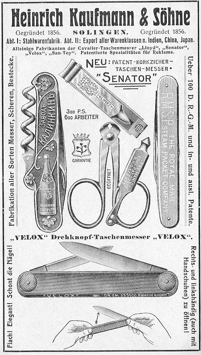 No.59817), 2 X KAUFMANN (1903 год пат. No.60872), Aero, Basta, Cabaret, Chile-Haus Hamburg , Circulus, Commerce, Coic Cullinan, Diktator, Dixi, Ercator, Formosa, Hercules, Indra, Imabut, Industry, Juamhikay, Kanzler, K55K, Klipeezy, Liga, Lloyd, Maxim, Manic, Mercatores, Mercaknife, Mercamess, Nivea, Old India, Old India Brand, Old No.55 Brand, Parcival, Prima Ballerina, Reva, Ringall, San Toy, Satrap, Senator, Schwebebahn, Shipping, Sieger, Si-Si, Solda, Soldatenfreund, Spick and span we show we can gent Kaufmann, Tantris, Terminus, Torpedo, Tosca, Touristenfreund, Trilby, Ut veniant omnes, Velox, Zodiac.