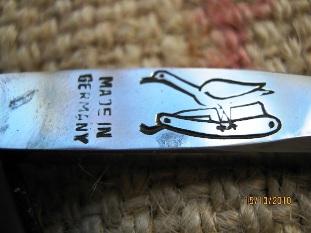Re: EMIL JANSEN SOLINGENАккуратненький, практически не пользованный, Янсен. Ширина лезвия 15 мм, ручка пластик "под дерево", внутри на ручке цифры 4/8 и G в круге. Состояние прекрасное, легкая поверхностная коррозия (местами).