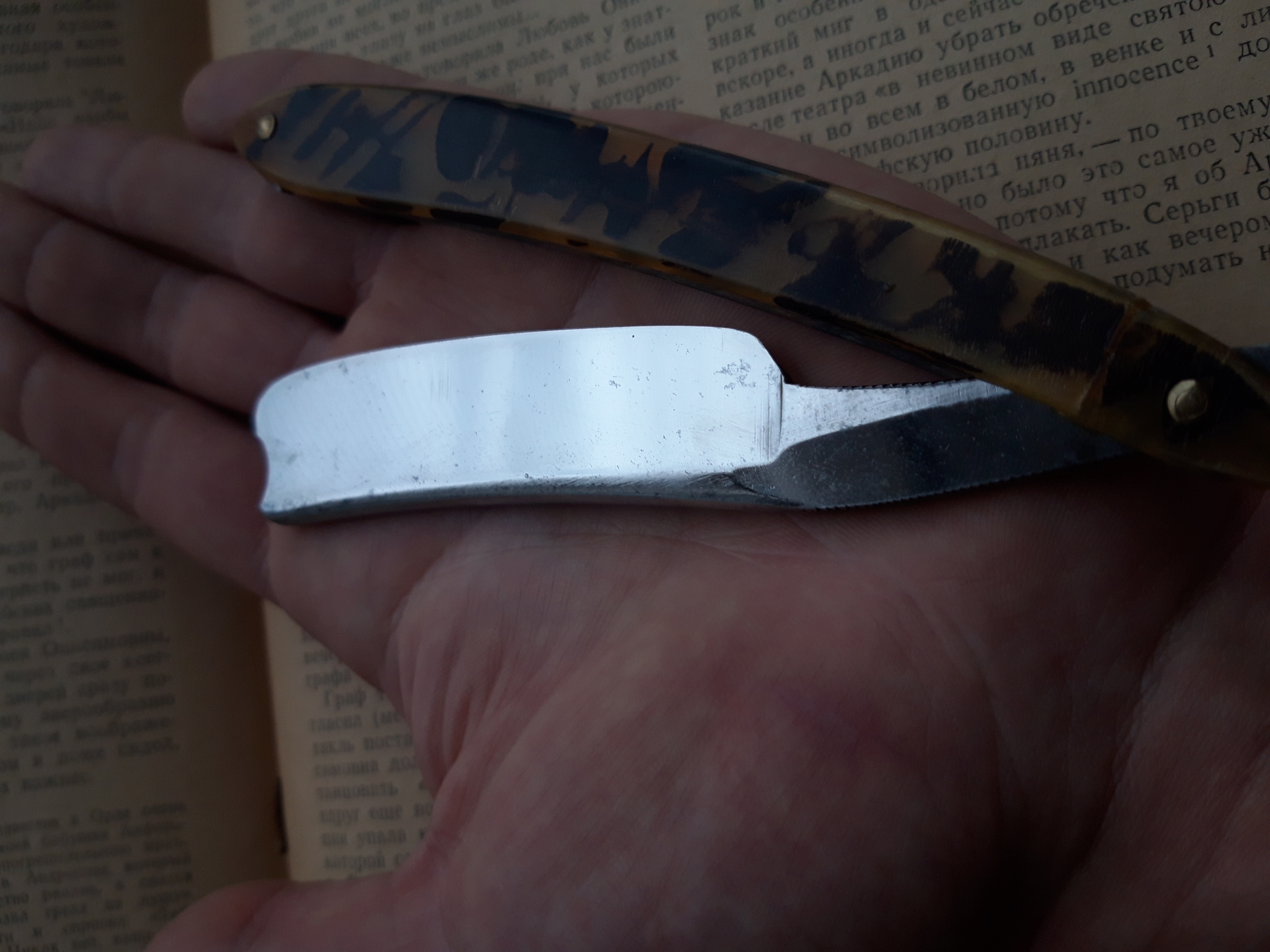 Я показывал клинок и клеймо а не оправку.А она действительно с француза 19 века. Не пропадать же добру. К тому же она не на продажу... бреет классно. Простите великодушно.