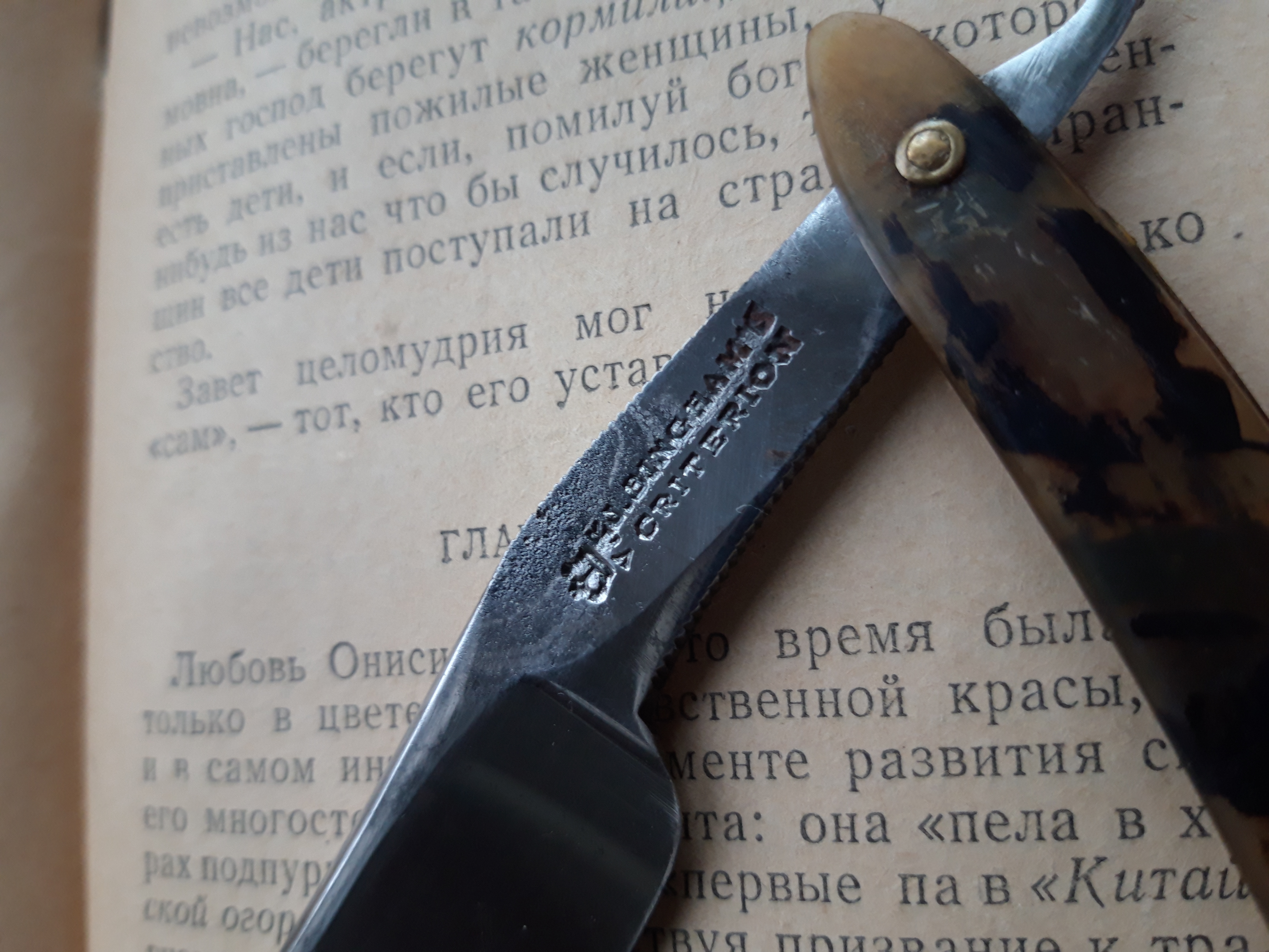 Я показывал клинок и клеймо а не оправку.А она действительно с француза 19 века. Не пропадать же добру. К тому же она не на продажу... бреет классно. Простите великодушно.