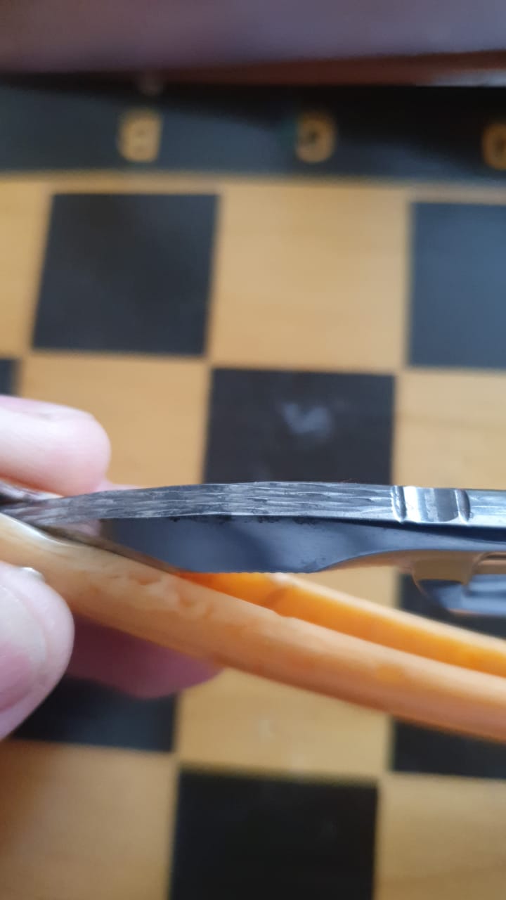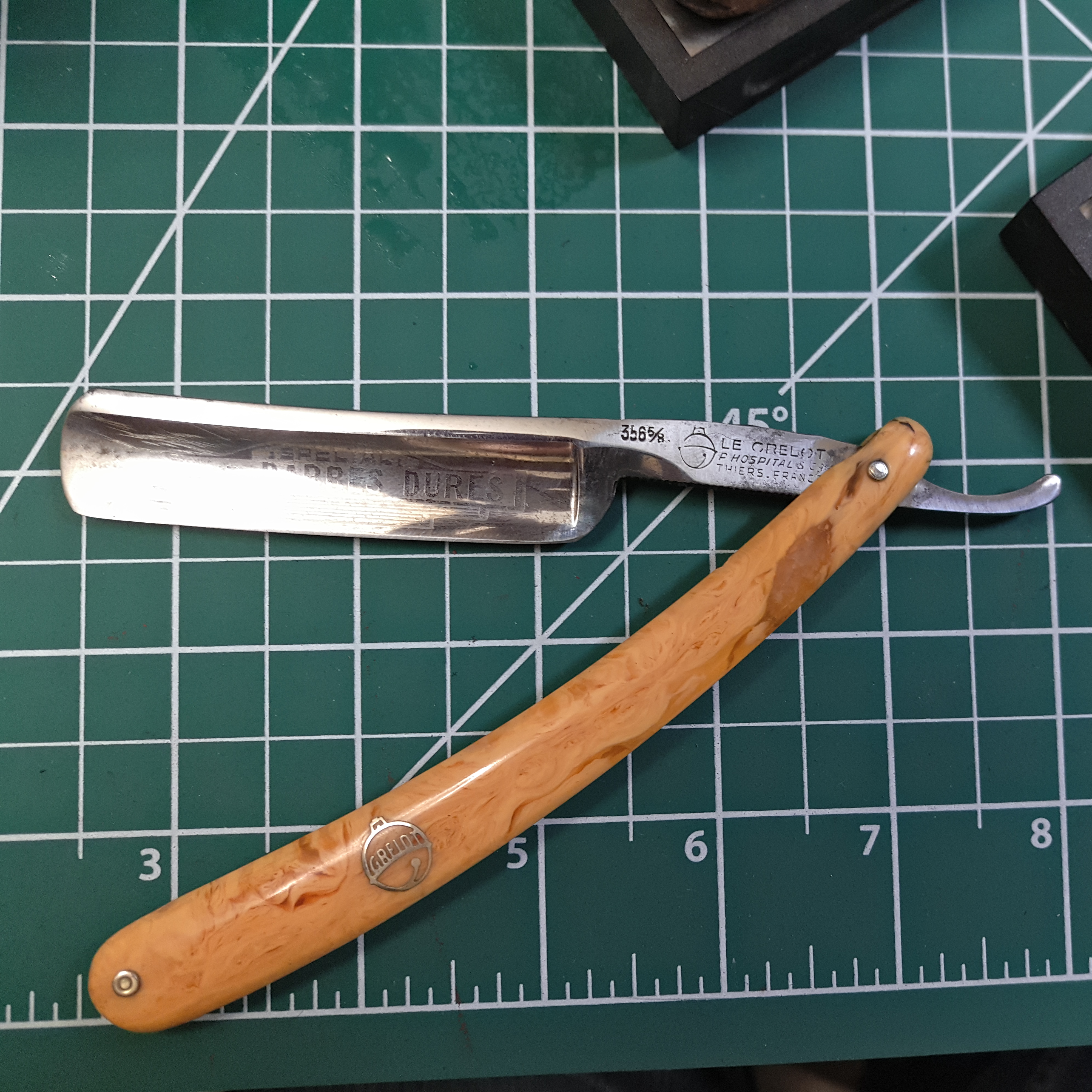 Следы времени убрал выборочно. На клинке полустертая гравировка. Будучи заточенной бреет мягко и чисто.