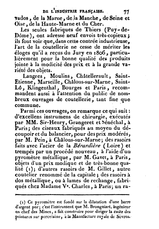 Среди этих работ отметим следующие: отличные хирургические инструменты, выполненные М.М. Сэр Генри, Гранжере и Сенешаль в Париже; ножницы, изготовленные с помощью ножа и маятника, по умеренным ценам, М. Пейном, в Шало-сюр-Марн; бритвы, изготовленные из стали Bérardière (Луара) и пропитанные новым способом с использованием металлического пирометра М. Гавта в Париже, объекты по низкой цене и очень хорошего качества. -lite (I) I другие бритвы от мистера Джилле, другого известного столичного ножа; бритвы с металлическими спинками или с запасными лезвиями, сделанные у мадам Ве. Чарльз в Париже