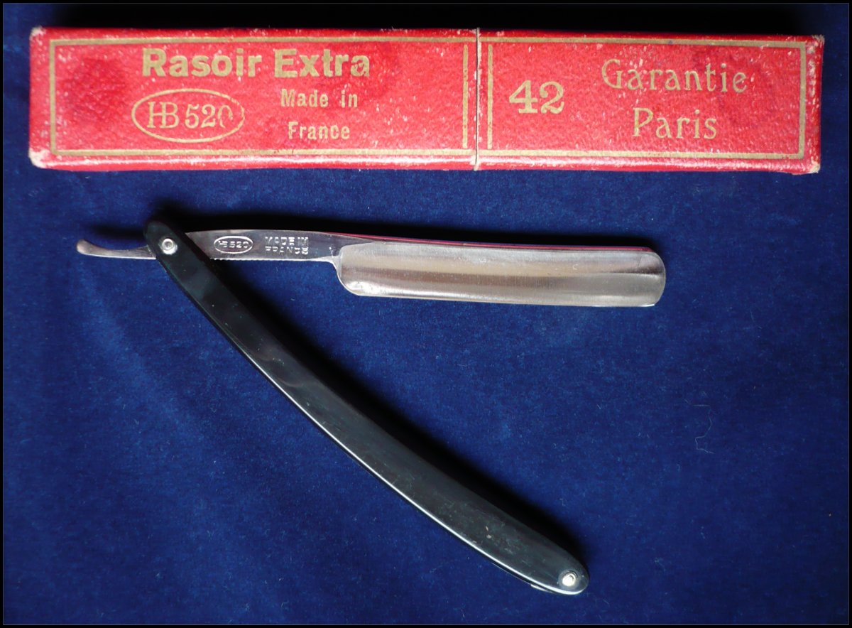 This 1920s French manufactured straight razor has the shank stamped on both sides. The face side has "42 Garantie Paris" and the reverse has "Made in France" along with a model number set in an oval cartouche "HB520". This relates to the 42 Honeless razor model produced by P. F. Ferrier of Paris. 42 Garantie Paris Show Re: 42 Garantie Paris, HB520тот продавец ошибся.