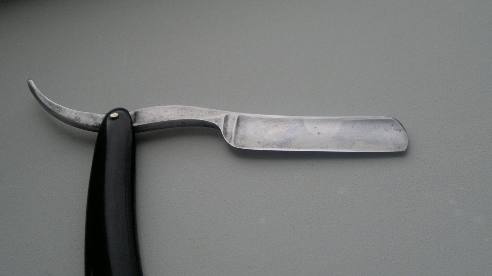 Итак - DE PEW Patent 1882 THE PERFECT RAZOR привлекла меня, прежде всего, формой "Monkey Tail" - обезьянний хвост. Взял. Ручка - рог. Форма и пропорции железа, действительно, изящные, удобный контроль, при ширине 5/8 длина режущей кромки всего 5,6 см. Да, внешне (на глаз, именно - пропорциями) и тактильно (по физике) производит очень приятное впечатление. Чуть почистил, поточил, побрился. Сразу оговорюсь: не стал насиловать, дабы не испортить. При минимуме усилий - результат на 4,8 по 5,5 балльной шкале