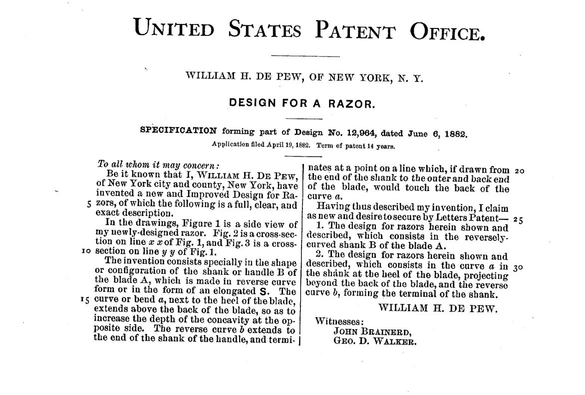 Да будет известно, что я, WILLIAM H. DE Pew, города и округа Нью-Йорк, штат Нью-Йорк, изобрел новый и улучшенный дизайн для бритв, который является полноправным, полным, что следуюет из его точного описания.