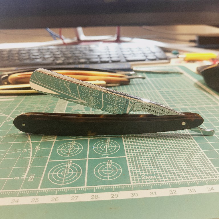 C.V. Heljestrand, EskilstunaДа, меня тоже оправа смутила - больше нигде не смог найти фотографию в такой оправе, но предположил, что возможно это из совсем старых мало сохранившихся экземпляров. Ещё смутила раковина на пяточке, как по мне в таких местах она появляется на бритвах уже бывших в пользовании.