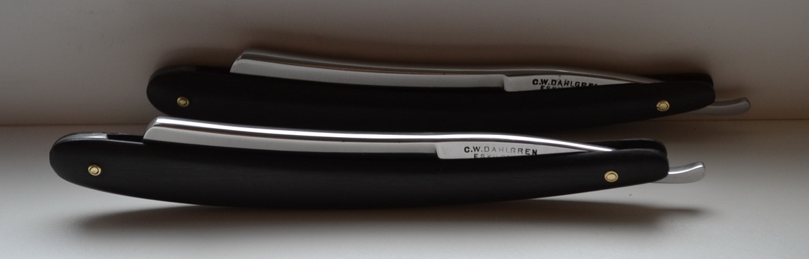 Действительно интересные бритвы. Тот что в кости имеет отличную геометрию, фаска ровненькая и тонкая. Re: C.W.DAHLGREN ESKILSTUNA SWEDEN 1878г.Два широких клина. Оба в дереве(эбен), оба 6/8. Клинышки - олово. Прекрасные экземпляры.