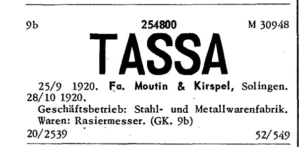 Moutin & Kirspel , Solingen in 1920, 1922 and 1925, Kasernenstrasse 24 in 1939. Brand names: 'Mundial', 'Sanitas', 'Tassa'. Open-blade razor and safety-razor maker.