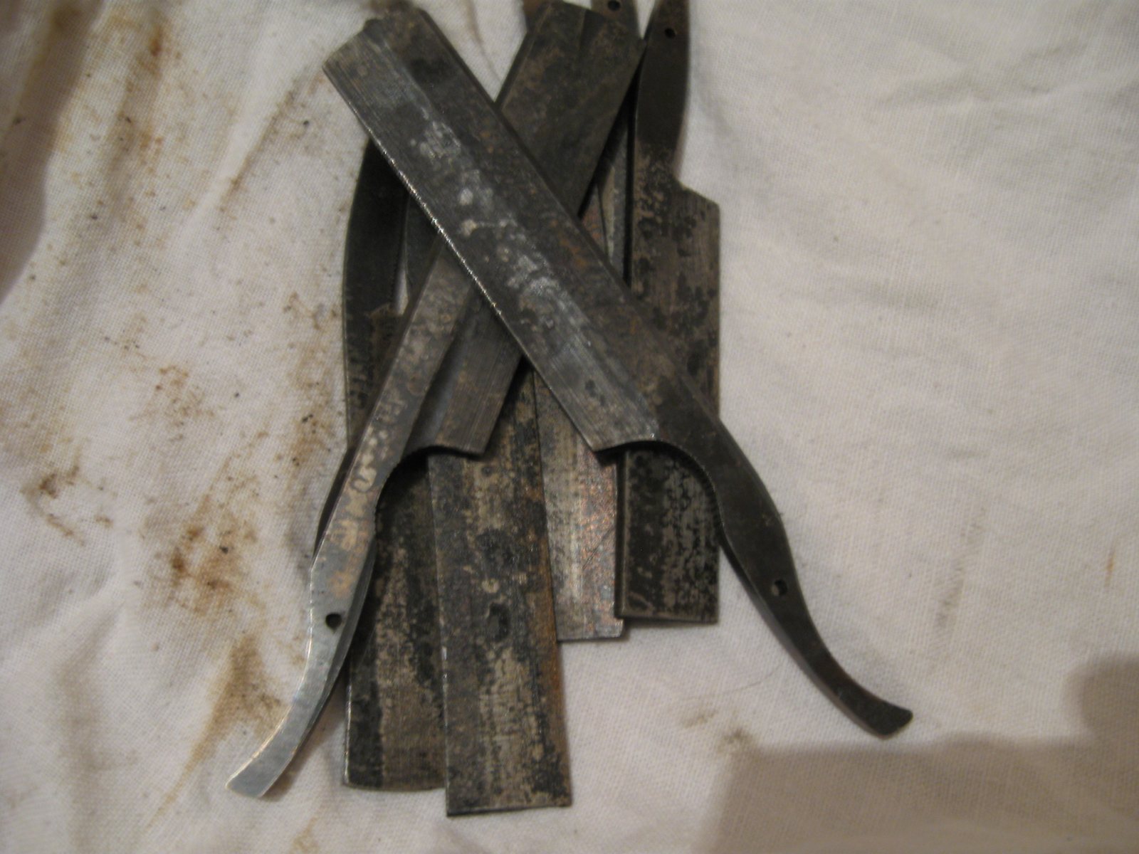 Re: Исследуем бритвы и не только.Cynic Да, согласен разница есть,ну хотя бы из У12А если грамотно проковать и термообработать потом ,я думаю получилась бы довольно не плохая бритва.Вот хочу "замутить" из ШХ15,попробовать как будет себя вести ,есть еще 9ХС и 60С2.Нравятся некоторые свойства обоих,но как будет себя вести именно в изделии таком как бритва - не известно.Попробую,расскажу и выложу.На фото мои заготовки,те что накрест это ШХ15,уже закаленные с отпуском.Я подозреваю ,что бритва будет из подшипника - огонь!