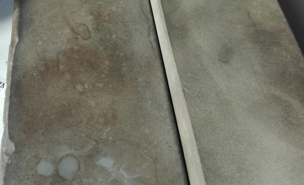 Следующий камень предположительно чарли форестер, на улице пасмурно лучше мобильным сделать фото не получается... Камень твердый, суспензию сам по себе не дает, если наводить чем то твердым то молочная еле сероватая. Мне два камня выдали, два заявлены как чарли форестеры, тот, что больше похож на чарли я уже опробовал стоят одинаково длинна ок. 9 дюймов ширина 2 дюйма, но этот можно распилить вдоль или на худой конец сурик с него отпилить, с первым такое не проделаешь там нижняя сторона вся побитая как у булыжника с мостовой и отслоения после выравнивания вылезли боюсь, что распиловку не переживет... Цвет камня темно-зеленый (если намочить особо зеленеву видно) цветом похож на чарли форестер, но у того зеленого чарли есть разводы красноватые (бурые), а у этого нет только на обратной стороне есть черное пятно (по которому его и определили как чарли, есть маленькие расплывчатые черные пятнышки), на лицевой стороне видно полупрозрачную прожилку есть трещинки и отслоения (как и у другого чарли). Камни при заточки вели себя "кажись одинаково", заточник бритв с меня еще не очень потому и "кажется". Брить после второго камня нет чего у продавца один чарли я купить не успел (тот был больше и весь полосатый как зебра) вот и второй у него берут, хочу себе третий взять потому вопрос - кто нибудь находил инфу (или в руках держал) о зеленых чарли форестерах с черными пятнами?