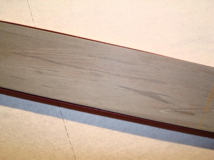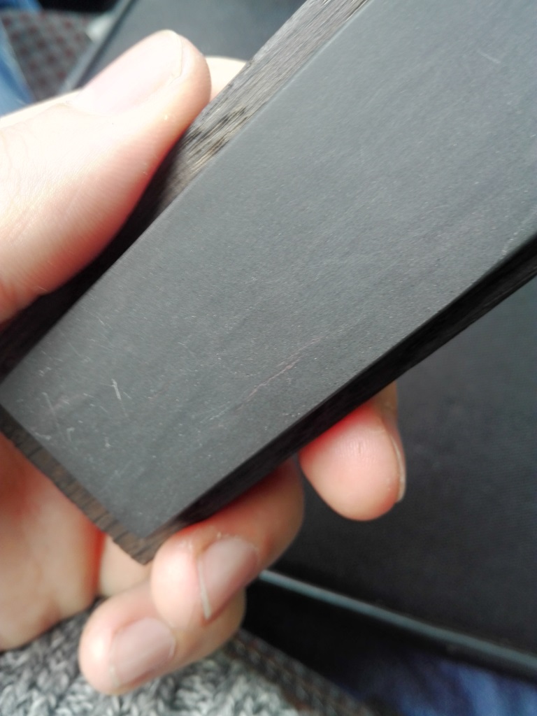 Теперь по камню, пробовали его на бритве Касуме, по случаю. Точили ту брутовку сначала не эшере, а данный камень отложили в сторонку ибо очень хотели познать дзен от эшерама и неизвесный камень вообще не имел не малейшего интереса, но образовался (видать перемедитировали) заусенец, который решили по быстрому убрать на более грубом непонятном камне похожего на новодел.