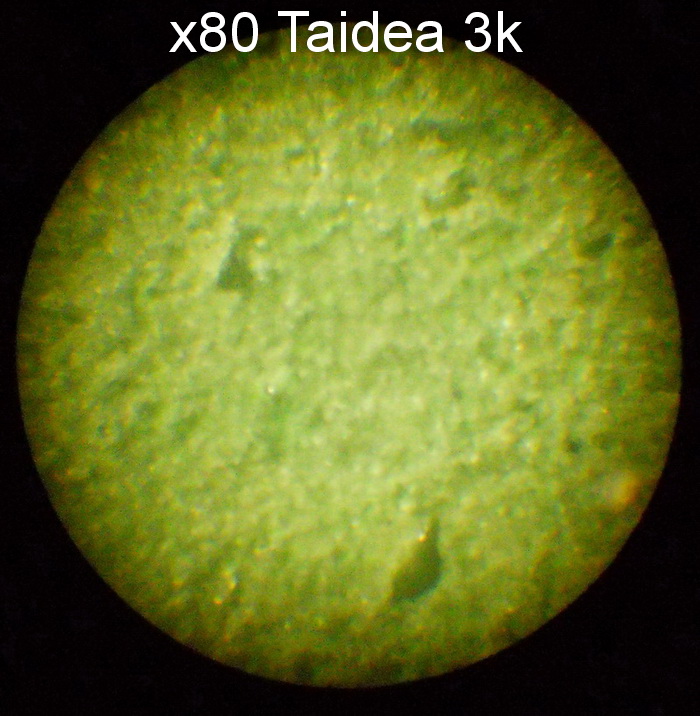 Мне тоже немного непонятно - на втором фото видно, что пятна на бруске явно от миллиметра до трёх скажем, но на снимке при увеличении в 80 раз при поле зрения 1,25 мм, они явно намного меньше. Это какой-то компьютерный микроскоп или оптика..? Можешь сделать просто фото окрашенного участка бруска на меньшем увеличении, может на снимке просто часть пятна окраски?