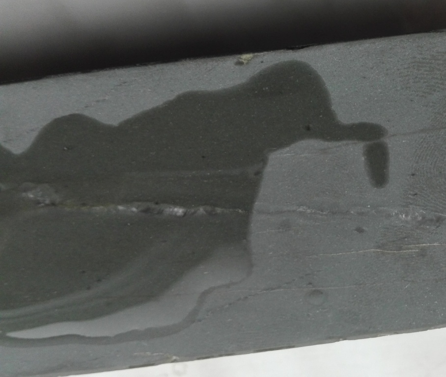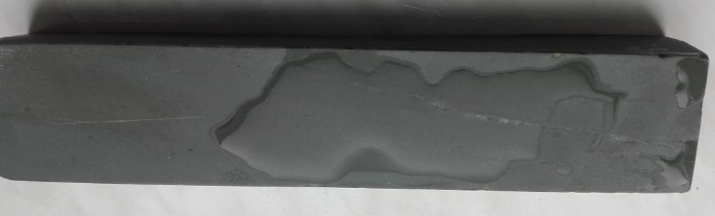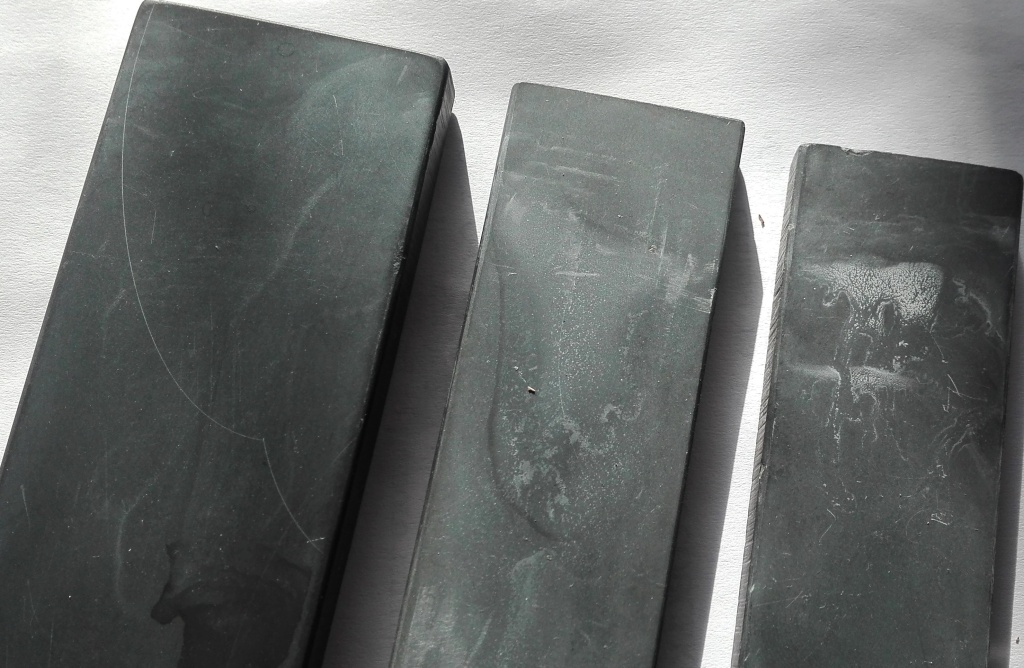Следующий камень предположительно чарли форестер, на улице пасмурно лучше мобильным сделать фото не получается... Камень твердый, суспензию сам по себе не дает, если наводить чем то твердым то молочная еле сероватая. Мне два камня выдали, два заявлены как чарли форестеры, тот, что больше похож на чарли я уже опробовал стоят одинаково длинна ок. 9 дюймов ширина 2 дюйма, но этот можно распилить вдоль или на худой конец сурик с него отпилить, с первым такое не проделаешь там нижняя сторона вся побитая как у булыжника с мостовой и отслоения после выравнивания вылезли боюсь, что распиловку не переживет... Цвет камня темно-зеленый (если намочить особо зеленеву видно) цветом похож на чарли форестер, но у того зеленого чарли есть разводы красноватые (бурые), а у этого нет только на обратной стороне есть черное пятно (по которому его и определили как чарли, есть маленькие расплывчатые черные пятнышки), на лицевой стороне видно полупрозрачную прожилку есть трещинки и отслоения (как и у другого чарли). Камни при заточки вели себя "кажись одинаково", заточник бритв с меня еще не очень потому и "кажется". Брить после второго камня нет чего у продавца один чарли я купить не успел (тот был больше и весь полосатый как зебра) вот и второй у него берут, хочу себе третий взять потому вопрос - кто нибудь находил инфу (или в руках держал) о зеленых чарли форестерах с черными пятнами?