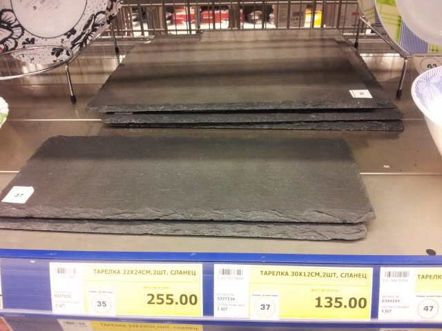 Тогда искать в том же METRO CC тарелки из сланца были или в области на рынках есть сланец правда надо выбирать,там очень много с прожилками.