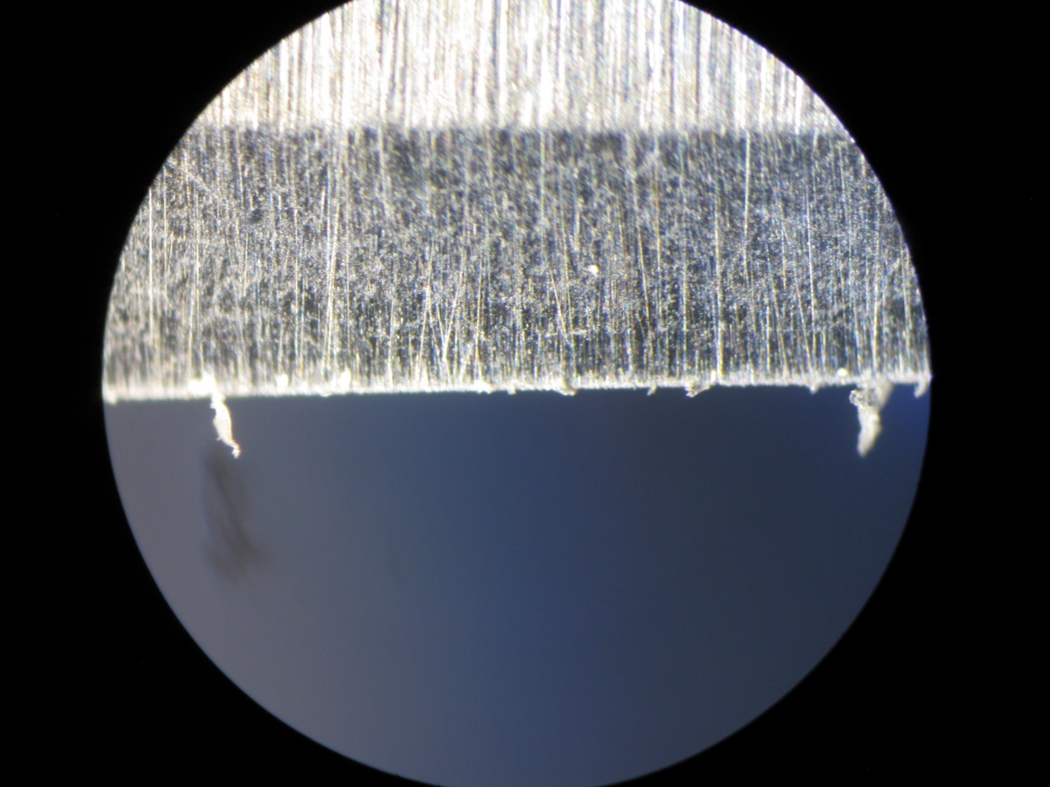 Итого: с использованием цусима-камня и цусима-нагура можно заточить бритву до состояния реза волоса на минимуме камней - 1000-цусима-финиш, но нужно следить за суспензией, хитрить и очень долго полировать кромку. Также отмечено постоянное микроскалывание кромки. Не ясно пока дело в бритве или в камне, но микропила держится постоянно и уходит только на финише. Зато для ножа это хорошо, поэтому тысячник+цусима-камень на кухню самое то. А для бритв надо покумекать как с ним быть, так-то камень достойный - быстрый, с однородным и тонким зерном - хорошая альтернатива котикулу и хватит надолго если не кокнуть, что сделать очень легко. А вот цусима-нагура отлично затирает риски на синтетиках до 6000 грит и может быть использовано вместо ботана. Но об этом потом - в следующем обзоре "о камне вакаса и его 5 друзьях". [spoiler=" фото кромки и самой бритвы после "цусима-гуанси-вакаса"] [/spoiler]