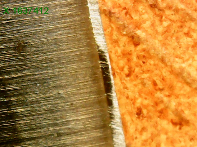 Re: Флудим о заточке (чё попало)Принесли бритву в заточку, японскую. Точена судя по всему была один раз и пользовалась немного. На камень легла почти идеально. Но вот что меня смутило - почти на самом носу на кромке есть как будно утоньшение, шириной миллиметра полтора не больше. И оно было проточено! На фото видно следы от моего тысячника, это я уже прилично так пошоркал. Так вот интересно мне две вещи :