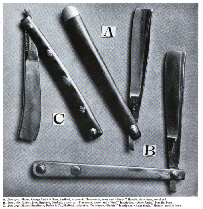 На многих бритвах восемнадцатого века выбито "cast steel" или "acier fondu", что датирует их позже 1772 года, момента начала коммерческого использования литой стали, которая дала Шеффилду превосходство в производстве ножевой продукции.