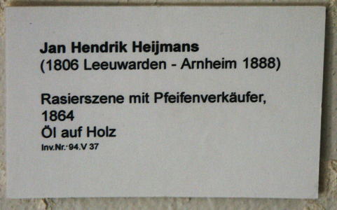 "Rasierszene mit Pfaiferverkäufer" 1864 Жан Хендрик Хейжманс "Сцена бритья с продавцом курительных трубок" 1864 schilder художник school Nederlands Недерланды Родился Leeuwarden 1806-02-19 Умер Arnhem 1888-05-26 Фотографировал я, в Золингене 29 мая 2003 года, в "Klingenmuseum" "Музей клинка". Не репродукция, оригинал висит в музее.