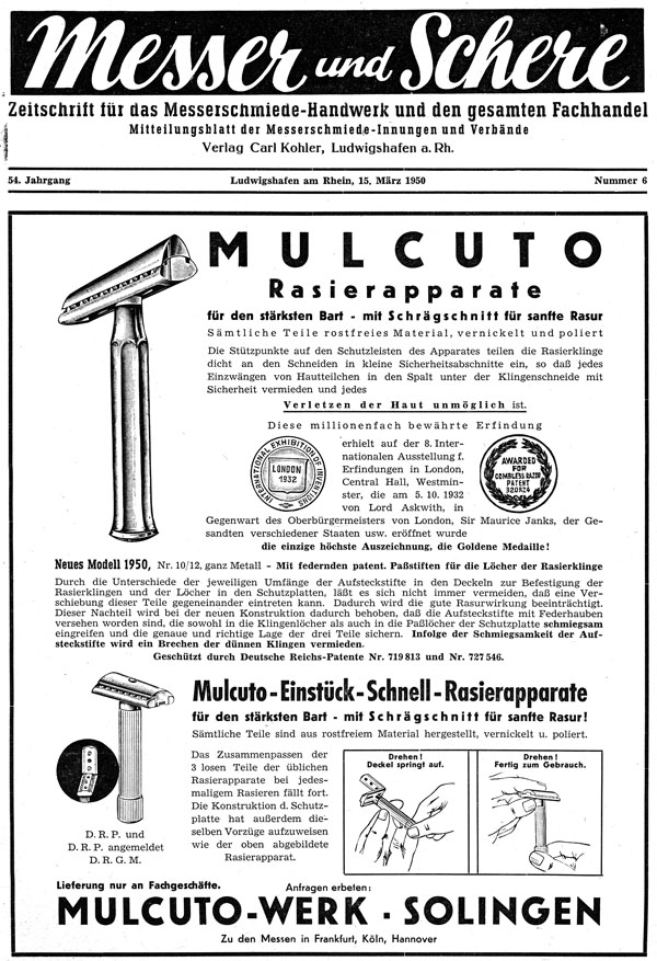 Литература по бритвам.Пролистывая фундаментальный каталог German knife and sword makers by J.Antony.Carter обратил внимание на сноску под одним из рекламных рисунков, мол это из Messer und Schere. Стал копать по этому словосочетанию и оказалось, что это название специализированного журнала для дилеров Золингена, с множеством рекламы и новостями ножевой промышленности. Пока отыскал сканы за 1950 год, ищу дальше))