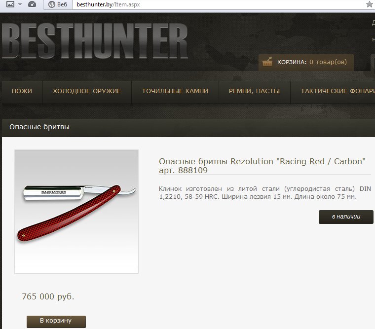 http://besthunter.by/Item.aspx?item=71" onclick="window.open(this.href);return false; Всего 765 000 руб!!! Сайт оказался белорусским, ложная тревога...хотя: Та же самая бритва, с другой ручкой, уже за 1 белорусский рубль. http://besthunter.by/Item.aspx?item=69" onclick="window.open(this.href);return false;