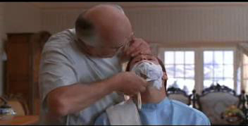 Хочу продолжить тему еще одним фильмом, с участием Джима Керри... Картина называется "Тупой и еще тупее", вышла также в 1994 году. Фильм повествует о двух друзьях - неудачниках, оставивших детство позади, но не избавившихся от детских привычек. Очень веселый фильм. По традиции несколько кадров с опасной бритвой. Кстати на плече у Джима Керри в этой сцене лежит полотенце, мастер вытирает бритву об это полотенце... Заклинания и молитвы работают только у тех, кто живет лицензионную версию жизни. (с) BOR