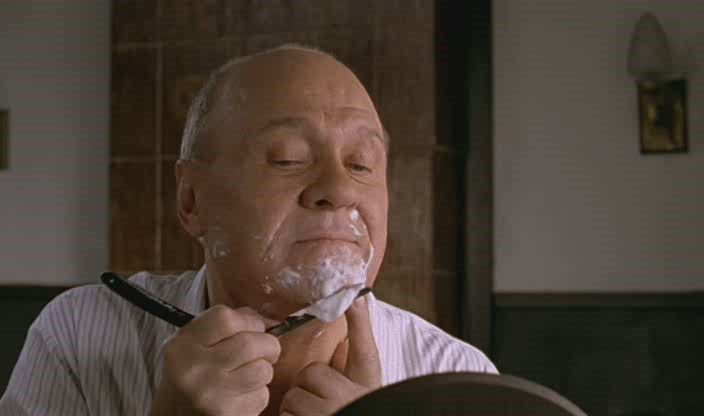 ..в кино "Офицеры" Юматов точно совершенно бреется.. правда, как-то странно, но кадр длиной с полторы-две секунды был.. кажется, когда он из Испании вернулся домой.. 23 февраля непременно покажут, можно будет уточнить.. ..примерно таким же образом, как Юматов, бреется и Юл Бриннер в кино "Братья Карамазовы", где-то в самом начале, после сцены рукоприкладства.. тоже только одну щеку, и в направлении от подбородка к уху, и после этого полотенцем стирает мыло со всей остальной части физиономии.. ..и еще было какое-то немецкое кино, про Германию конца 20-х или начала 30-х, где подростки - один поэт, второй просто скучающий аристократ, в сестру которого, развратную донельзя барышню, поэт был, кажется, влюблен - договорились, что вместе покончат с собой, как только что-то осознают (пардон, я как-то насмерть забыл, что именно).. стало быть, перед актом самоубийства этот аристократ (Гюнтер его звали, как будто), очень правдоподобно бреется опасной бритвой.. хотя, я так тоже пробовал - порезы остаются, но у Гюнтера лицо очень благородное, ему, возможно, легче было.. по "Культуре", кстати, любят показывать (они все там любят по нескольку раз показывать; можно подумать, фильмов достойных всего несколько штук снято, прошу прощения за отступление). ..это я к тому, что ежели повспоминать, то много чего в памяти всплывет.. ..с уважением, Костя Продолжаю тему отечественного кинематографа. Художественный сериал по мотивам произведений Артура Конан-Доиля "Приключения Шерлока Холмса и доктора Ватсона" картина носит название "Король шантажа". В самом начале фильма мы наблюдаем сцену бритья одного из главных персонажей, доктора Ватсона.
