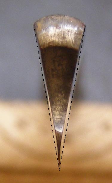 Верхняя часть - треугольник, а нижняя, где кромка (ненавижу слово "жало"  ) - сплющена и немного вытянута.