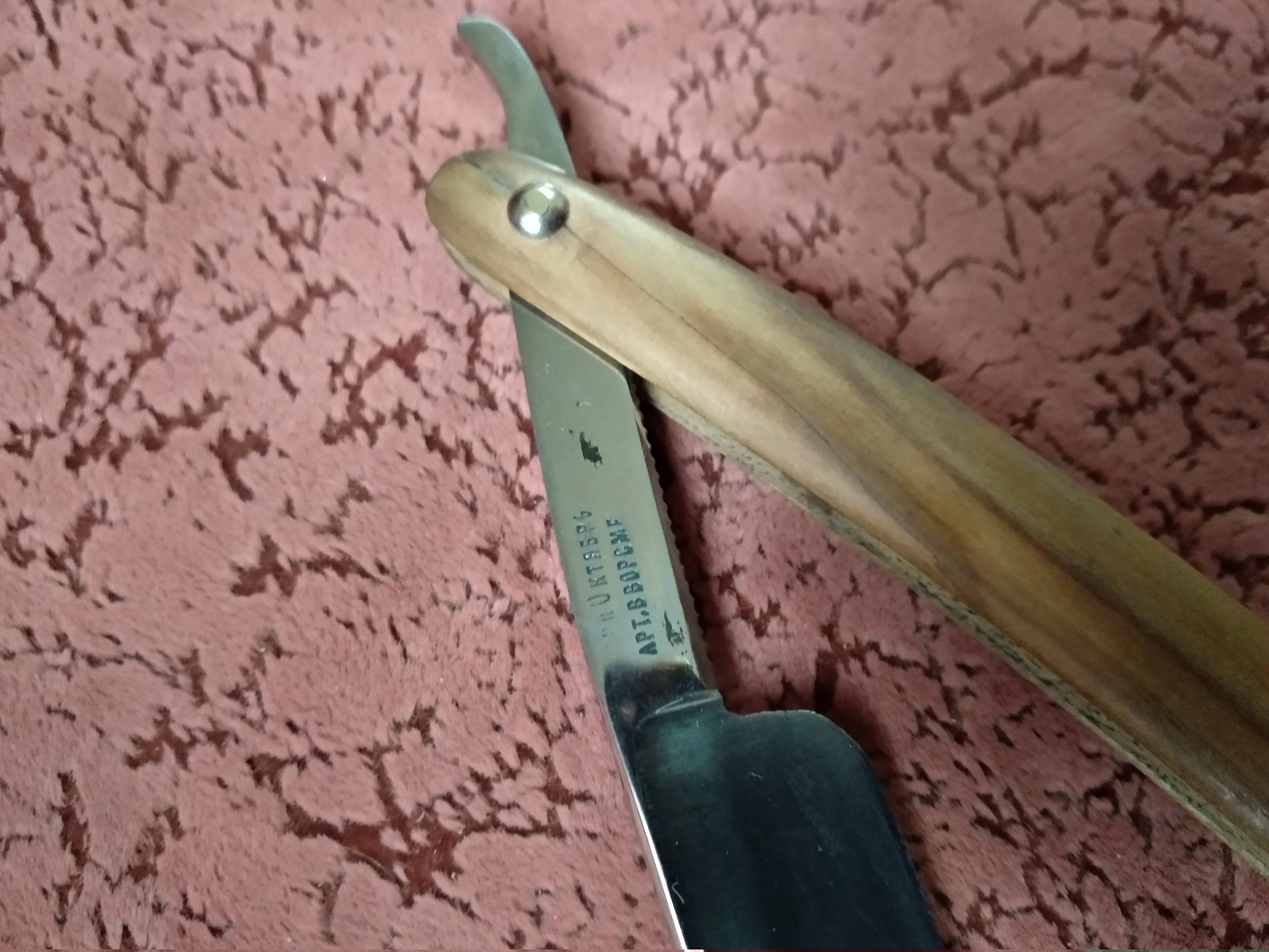 Ворсминская артель Красный Октябрь, ВАКОВот такой прекрасный-Красный Октябрь попал мне на заточку и небольшие косметические работы. Клинок чистить не стал,а просто немного полирнул,чтобы оставить все оригинальную шлифовку. Касаемо оправы,то тут пришлось повозиться,так как был отколот крупный кусок дерева. Разобрал бритву,проклеил с обеих сторон,также вклеил намертво одну из внутренних шайб(как раз шайба шла по трещине) и заново собрал бритву. Поставил вот такие пины-шляпки для надёжности,чтобы ручка снова не раскололась по трещине Вроде,удалось сохранить оригинальный вид...
