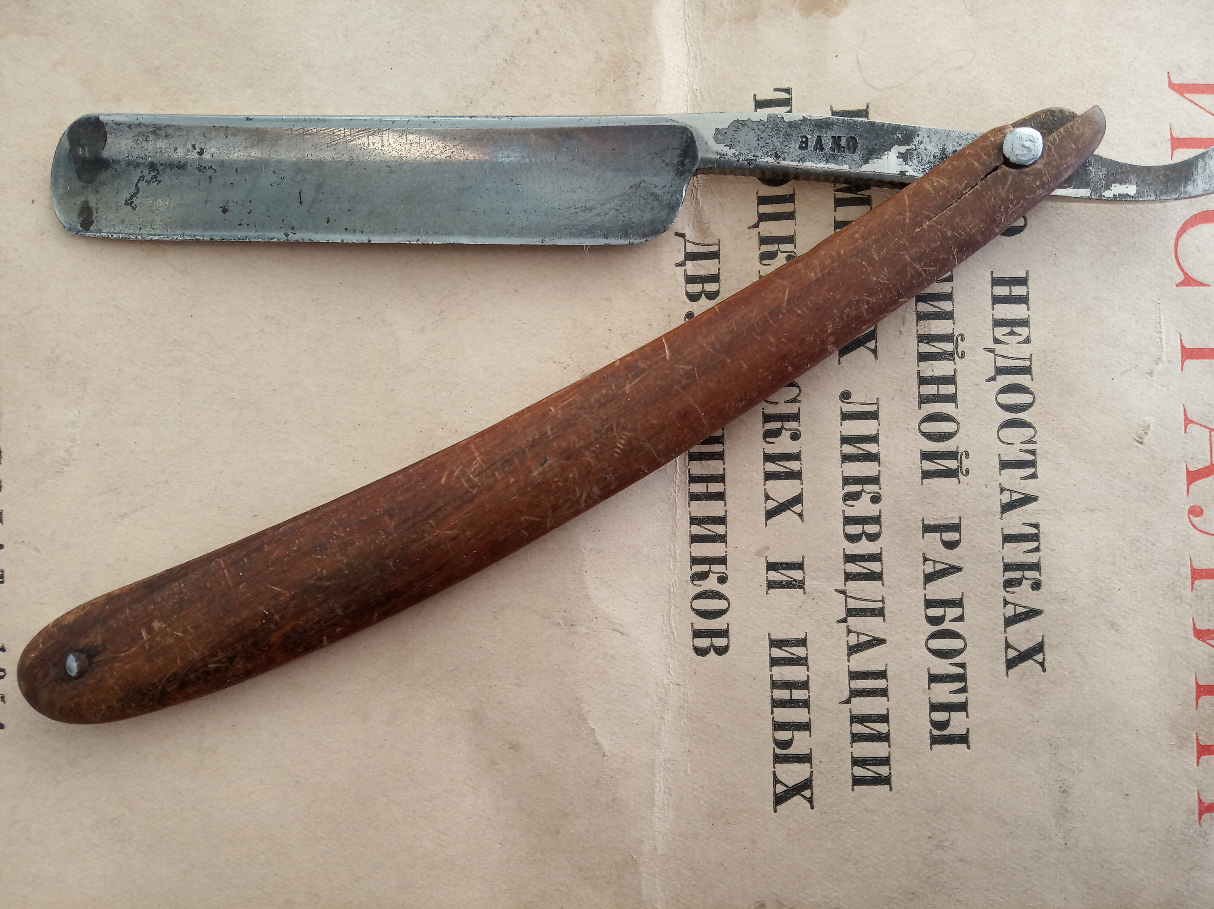 Ворсминская артель Красный Октябрь, ВАКОВот такой прекрасный-Красный Октябрь попал мне на заточку и небольшие косметические работы. Клинок чистить не стал,а просто немного полирнул,чтобы оставить все оригинальную шлифовку. Касаемо оправы,то тут пришлось повозиться,так как был отколот крупный кусок дерева. Разобрал бритву,проклеил с обеих сторон,также вклеил намертво одну из внутренних шайб(как раз шайба шла по трещине) и заново собрал бритву. Поставил вот такие пины-шляпки для надёжности,чтобы ручка снова не раскололась по трещине Вроде,удалось сохранить оригинальный вид...